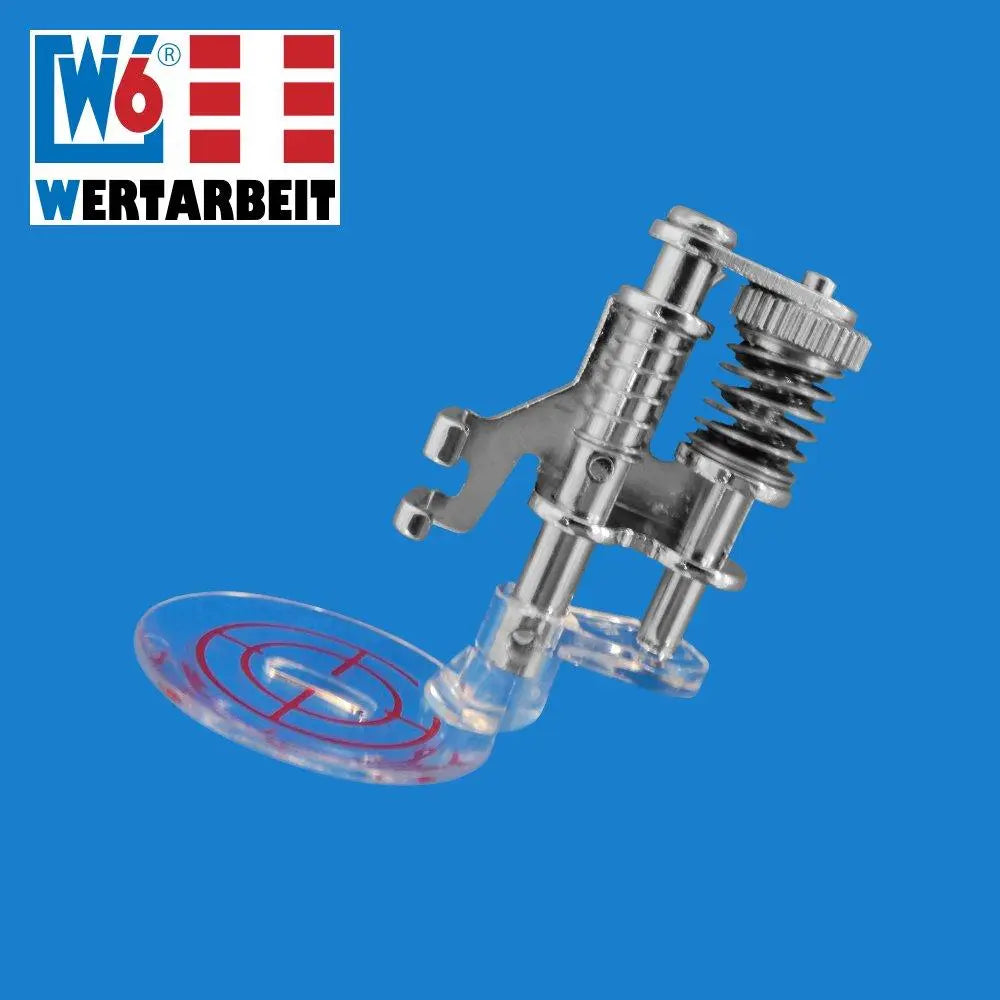Der spezielle Nähmaschinen Rulerfuß ist immer kreisrund und frei verstellbar. Der Abstand zwischen Nadel und Rulerfußkante beträgt 1/4 Inch. Der Rand ist mehrere Millimeter hoch und kann damit bequem und sauber an den W6 WERTARBEIT Ruler /Linealen entlang geführt werden. Der spezielle Nähfuß ermöglicht Ihnen ein linealbasiertes Quilten.